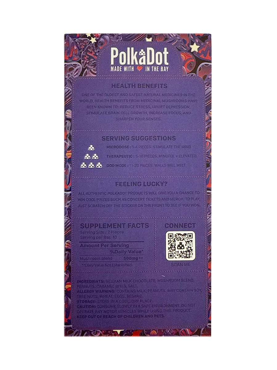 Treat yourself to the irresistible flavors of Caramel Peanut Swirl PolkaDot Magic Mushroom Belgian MIlk Chocolate. Each bite blends indulgence with intention. Order now from our online headshop, Olofly, and discover how delicious magic can be.